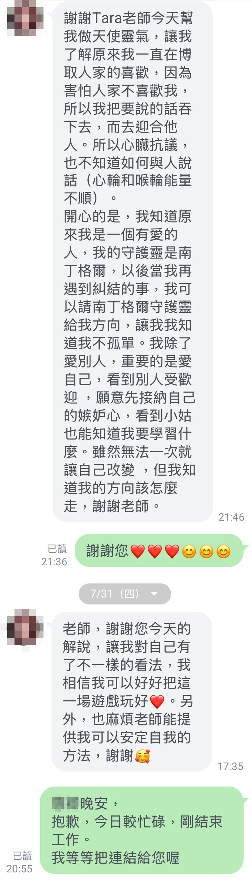 謝謝Tara老師今天幫我做天使靈氣,讓我了解原來我一直在博取人家的喜歡,因為害怕人家不喜歡我,所以我把要說的話吞下去,而去迎合他人。